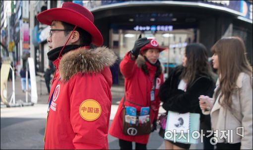 [아시아경제 윤동주 기자] 6일 서울 중구 명동 쇼핑거리에서 관광통역안내원이 관광객들을 기다리고 있다.