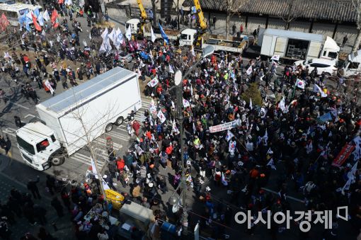 [아시아경제 문호남 수습기자] 박근혜 대통령 탄핵심판 사건 선고를 하루 앞둔 9일 서울 종로구 헌법재판소 인근 도로에서 열린 박근혜 대통령 탄핵 기각 집회에.