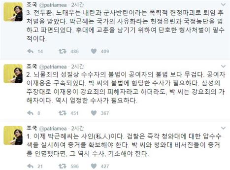 10일 조국 교수는 자신의 트위터를 통해 “이제 박근혜 씨는 사인(私人)이다”며 “검찰은 즉각 청와대에 대한 압수수색을 실시하여 증거를 확보해야 한다. 박씨와 청와대 비서진들이 증거를 인멸했다면, 그 역시 수사, 기소해야 한다”라고 목소리를 높였다.