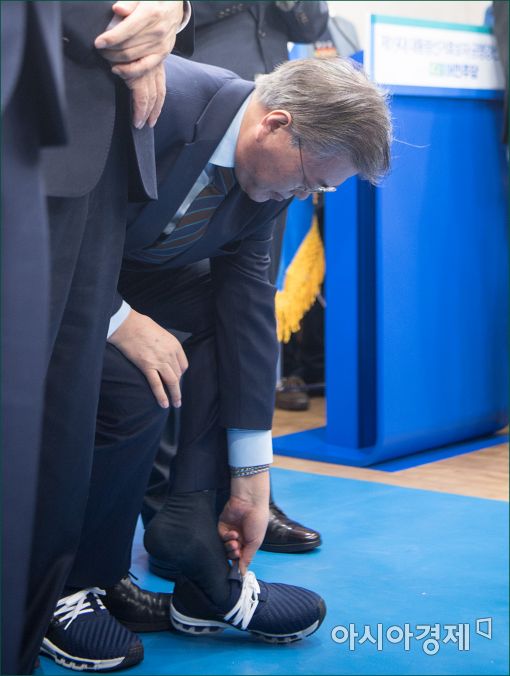[아시아경제 윤동주 기자] 문재인 더불어민주당 전 대표가 14일 서울 여의도 당사에서 열린 공명선거 경선 선언식에서 추미애 대표에게 선물 받은 운동화로 갈아 .