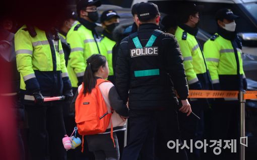 [아시아경제 문호남 수습기자] 16일 강남구 삼성동 박근혜 전 대통령 자택 앞에서 경찰이 어린이의 하굣길을 동행하고 있다.