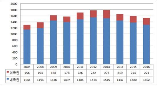 연도별 추이에선 2007년 외국인 156건·내국인 1148건에서 2013년 외국인 276건·내국인 1515건으로 오르며 정점을 찍었지만 지난해는 외국인 221건·1302건으로 줄어 증가세가 한풀 꺾인 양상이다.