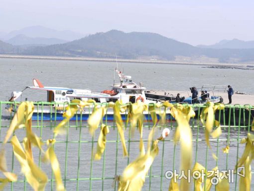 [아시아경제 백소아 기자] 30일 전라남도 진도군 팽목항에서 세월호 미수습자 가족들이 세월호 인양과정을 지켜보기 위해 배에 오르고 있다.