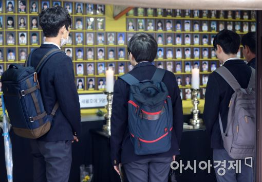 [아시아경제 문호남 수습기자] 세월호 참사 1081일 만에 선체가 전남 목포신항에 도착한 31일 서울 종로구 광화문 광장에 마련된 세월호 분향소를 찾은 고등학생.