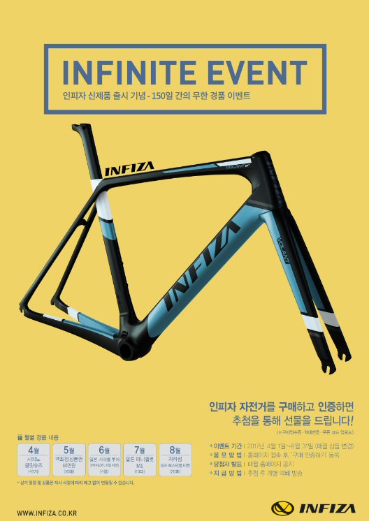 인피니트 이벤트 참여 방법은 인피자 자전거를 구매 후 인피자 공식 홈페이지에 접속, '구매 인증하기'를 통해 구매 영수증과, 차대번호, 쿠폰 코드를 등록하면 된다.