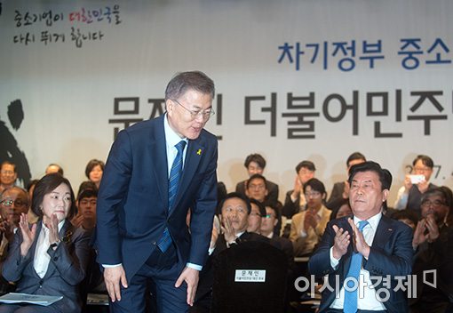 [아시아경제 윤동주 기자] 문재인 더불어민주당 대통령후보가 10일 서울 여의도 중소기업중앙회에서 열린 '차기정부 중소기업 정책관련 강연회'에 참석, 기업인들.