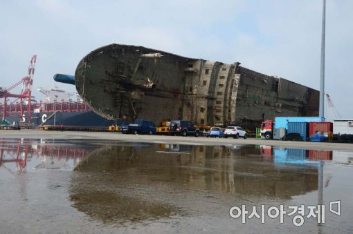 [아시아경제 백소아 기자] 11일 전남 목포신항 철재부두에서 관계자들이 세월호 선체 아래에 모듈 트랜스포터(TM)를 제거하는 작업을 하고 있다. 해수부는 세월호 거치가 완료되면 일주일간 외부세척과 방역, 산소농도와 유해가스 측정, 안전도 검사를 하면서 미수습자 9명을 찾기 위한 수색작업을 준비한다.