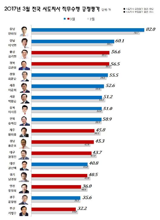 지지율이 가장 낮은 시도지사는 서병수 부산시장(32.2%)이었다. 이어 윤장현 광주시장(35.6%), 유정복 인천시장(36%)으로 나타났다.