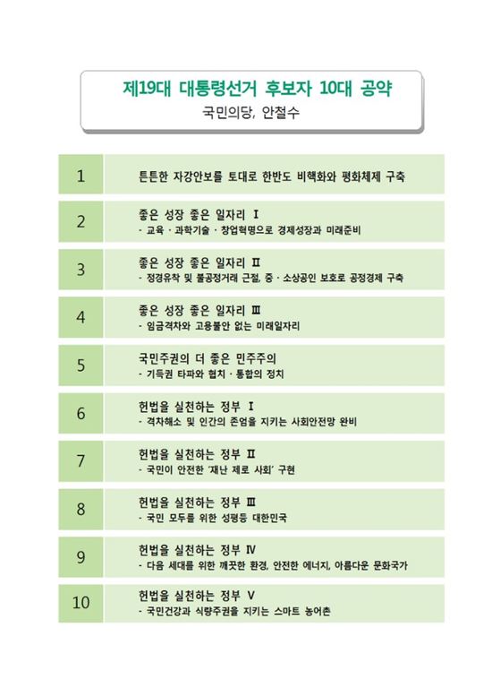 안 후보 측은 이날 오후 보도자료를 내고 전날 중앙선거관리위원회에 제출한 대선 10대 공약을 공개했다.