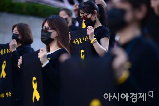 [아시아경제 문호남 수습기자] 세월호 참사 3주기를 하루 앞둔 15일 서울 종로구 세종문화회관 계단에서 세월호 추모 단체, 리멤버 0416 회원들이 3주기 퍼포먼스.