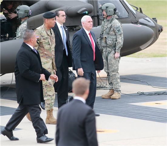 [사진공동취재단] 방한 중인 마이크 펜스 미국 부통령이 17일 오전 판문점 방문을 위해 경기도 파주시 문산읍 캠프 보나파스에 헬기를 타고 도착하고 있다. 2017.