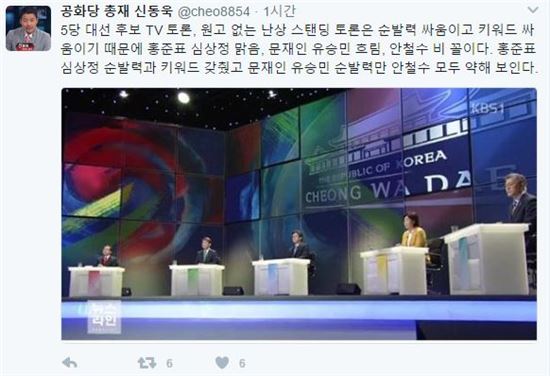 신 총재는 이날 트위터를 통해 “5당 대선 후보 TV 토론, 원고 없는 난상 스탠딩 토론은 순발력 싸움이고 키워드 싸움이기 때문에 홍준표 심상정 맑음, 문재인 유승민 흐림, 안철수 비 꼴이다. 홍준표 심상정 순발력과 키워드 갖췄고 문재인 유승민 순발력만 안철수 모두 약해 보인다”며 이같이 말했다.