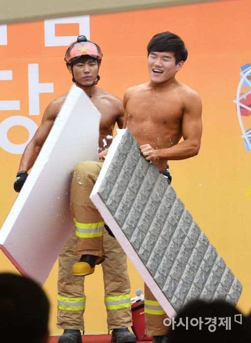 [아시아경제 백소아 기자] 20일 서울 영등포구 여의도공원 문화의광장에서 서울안전체험한마당의 일환으로 열린 제6회 몸짱소방관 선발대회에서 참가 소방관들이 .