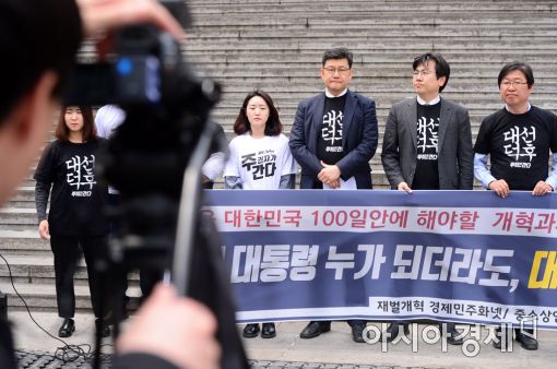 [아시아경제 문호남 수습기자] 재벌개혁과 경제민주화 실현 전국네트워크 관계자들이 25일 서울 종로구 세종문화회관 계단 앞에서 '새로운 대한민국 100일 안에 해야 할 개혁과제' 기자회견을 열고 있다. 이들은 중소상인, 자영업자, 노동자, 청년 등 각계각층의 요구를 모아 재벌 대기업의 중소기업 기술편취 방지, 카드수수료 인하, 정규직 고용 원칙 확립 등 30개 핵심개혁과제를 발표했다.