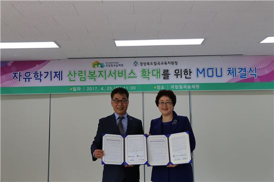 [아시아경제(대전) 정일웅 기자] 한국산림복지진흥원은 25일 경북 칠곡군 유학로 소재 국립칠곡숲체원과 칠곡교육지원이 업무협약을 체결, 지역 청소년을 대상으로 한 산림복지서비스 확대에 상호 협력키로 했다고 밝혔다. 협약에 따라 양 기관은 ▲청소년 대상 산림복지서비스 ▲자유학기제·진로직업체험과 연계한 청소년 산림체험교육 ▲산림교육 협업 확대 및 상호 인프라 구축 등에 협력할 계획이다. 칠곡숲체원 조두연 원장(왼쪽)과 칡고교육지원청 김성란 교육장(오른쪽)이 기념사진을 찍고 있다. 한국산림복지진흥원 제공