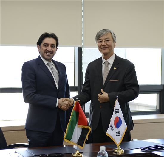 [아시아경제(대전) 정일웅 기자] 특허청은 26일 서울 강남구 역삼동 소재 서울사무소에서 최동규 특허청장과 UAE 모하메드 알 쉐히(Mohammed Al shihhi) 경제부 차관이 만나 UAE 현지의 특허심사수행 성과를 공유하고 심사관 파견을 위한 계약서에 서명을 했다고 밝혔다. 최 청장(오른쪽)과 모하메드 알 쉐히 차관(왼쪽)이 기념사진을 찍고 있다. 특허청 제공