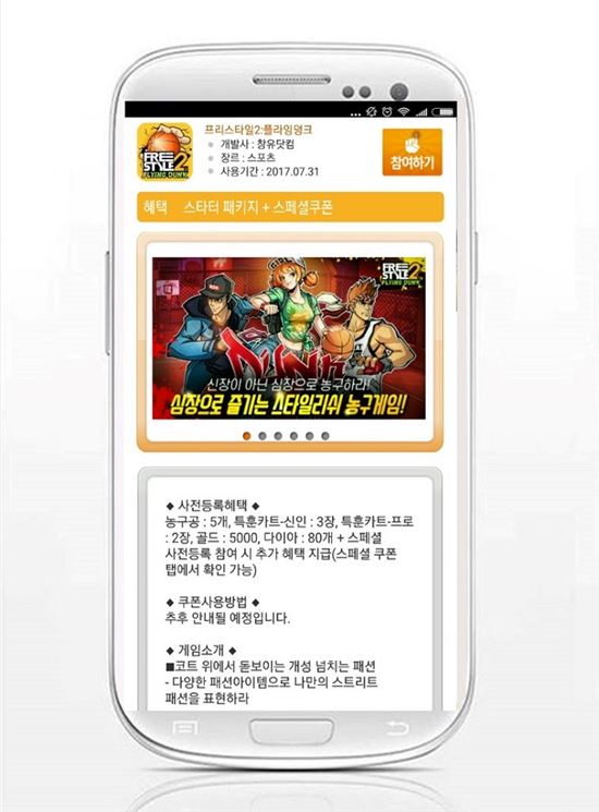 이번에 쿠폰이 추가된 게임은 ‘프리스타일2: 플라잉덩크’로 별다른 미션 없이 사전예약 신청만 해도 ‘농구공 5개’, ‘5,000골드’, ‘다이아 80개’ 등으로 구성된 ‘스타터 패키지’를 지급한다.
