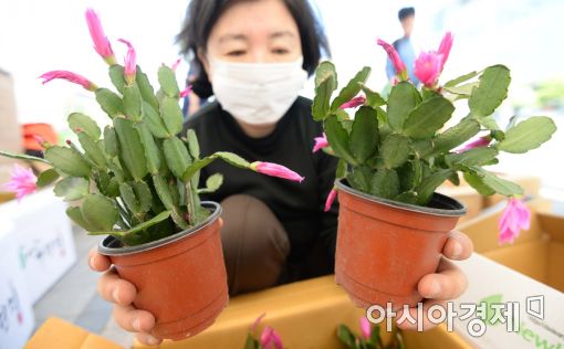 [아시아경제 문호남 수습기자] 중국발 미세먼지가 연일 기승을 부리고 있는 1일 서울 종로구 청계광장에서 열린 '공기정화식물 직거래장터'에서 마스크를 쓴 시민이 공기정화식물을 살펴보고 있다. 판매수종은 수염 틸란드시아, 보스톤고사리, 아이비 등 총 6종이며 오는 2일까지 열린다.