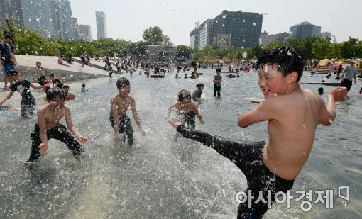 [아시아경제 문호남 수습기자] 서울 낮 최고기온이 30도로 초여름 더위를 보인 3일 서울 여의도 물빛광장을 찾은 시민들이 물놀이를 하며 더위를 식히고 있다.