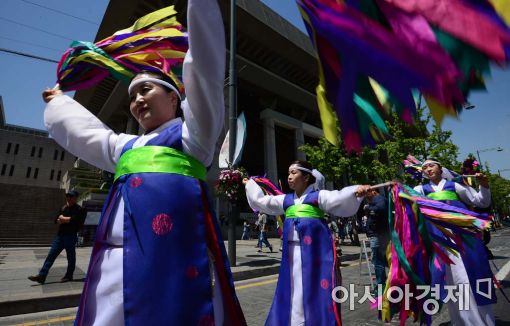 [아시아경제 백소아 기자] 7일 서울 종로구 광화문광장에서 유네스코 인류무형문화유산으로 선정된 강릉단오제를 알리기 위한 단오굿 공연이 펼쳐지고 있다.