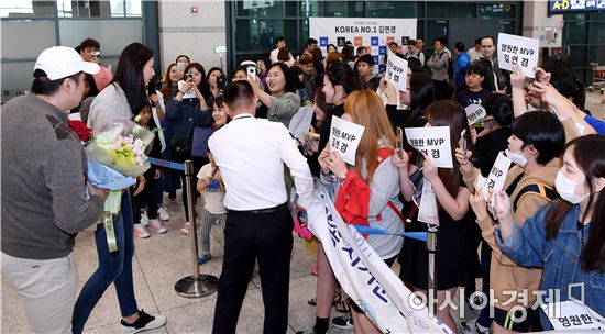 [영종도=아시아경제 김현민 기자]터키 여자배구에서 소속팀 페네르바체의 통산 5번째 우승을 이끈 '배구 여제' 김연경이 8일 인천국제공항을 통해 귀국하고 있다.