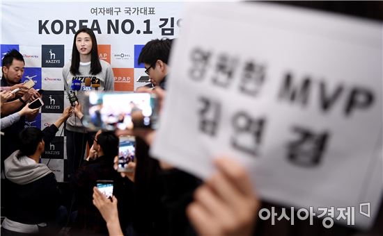 [영종도=아시아경제 김현민 기자]터키 여자배구에서 소속팀 페네르바체의 통산 5번째 우승을 이끈 '배구 여제' 김연경이 8일 인천국제공항을 통해 귀국한 뒤 인터뷰하고 있다.