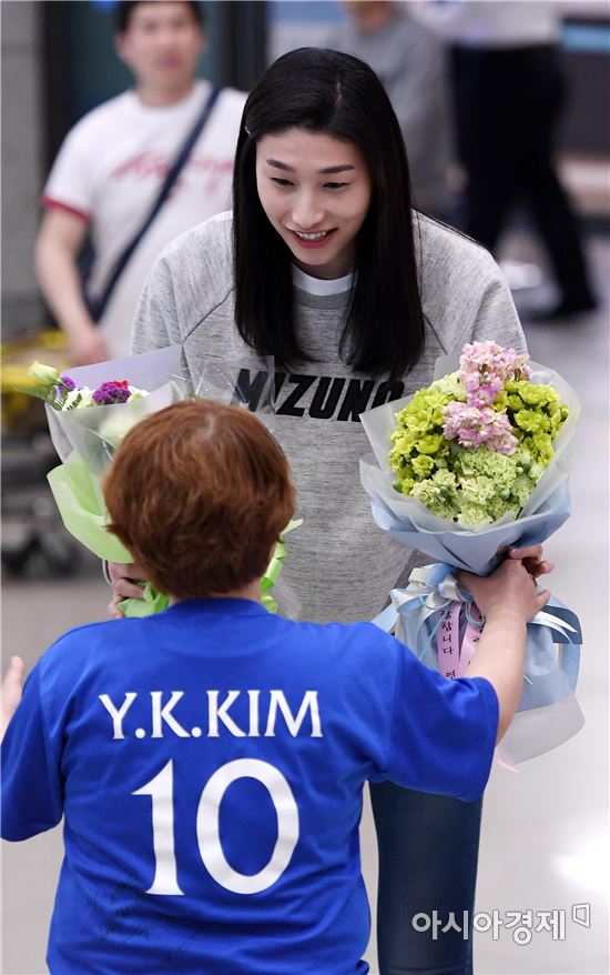 [영종도=아시아경제 김현민 기자]터키 여자배구에서 소속팀 페네르바체의 통산 5번째 우승을 이끈 '배구 여제' 김연경이 8일 인천국제공항을 통해 귀국하고 있다.