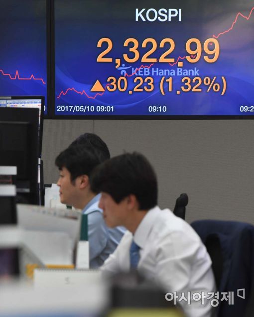 [아시아경제 백소아 기자] 10일 서울 중구 외환은행 본점 딜링룸 전광판에 코스피 지수가 2300을 넘어 상승세를 이어가고 있다. 이날 코스피 지수는 장중 2323.