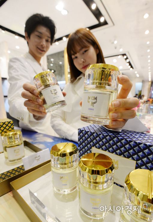 [아시아경제 문호남 수습기자] MCM 홍보 도우미들이 11일 서울 중구 롯데백화점 본점 매장에서 유니섹스 퍼퓸 '인피니트 컬렉션(INFINITE COLLECTION)을 선보이고 있다. 인피니트 컬렉션은 프랑스 출신 제롬 디 마르노(Jerome Di Marno)가 참여했으며 인센스(Incense), 화이트 티(White Tea), 오리스(Orris)의 세 가지로 구성됐다.