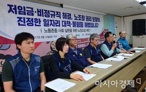 [아시아경제 백소아 기자] 12일 서울 중구 민주노총 사무실에서 열린 노동존중 사회 실현을 위한 노-정 교섭 제안 기자회견에서 최종진 민주노총 위원장 직무대행(왼쪽 다섯번째)이 여는 발언을 하고 있다.