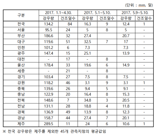 $pos="C";$title="올해 1월 1일~5월 10일 전국 시·도별 기상 현황자료. 산림청 제공";$txt="올해 1월 1일~5월 10일 전국 시·도별 기상 현황자료. 산림청 제공";$size="550,474,0";$no="2017051414131293379_2.png";@include $libDir . "/image_check.php";?>