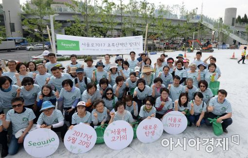 [아시아경제 문호남 수습기자] 공중보행로 서울로 7017 개장(20일)을 나흘 앞둔 16일 서울 만리동 광장에서 '서울로 초록산책단' 발대식이 열리고 있다. 21세부터 76세까지 다양한 연령대로 구성된 서울시 초록산책단은 서울로 7017의 시설관리와 월~토요일 상시 운영되는 인형극 등 5종의 시민참여 프로그램을 진행한다.