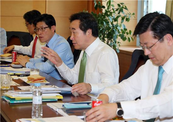 [아시아경제 조영주 기자] 이낙연 국무총리 후보자(오른쪽 두번째)가 18일 서울 통의동 금융감독원 연수원에 마련된 사무실에서 간부들과 오찬으로 샌드위치를 먹.