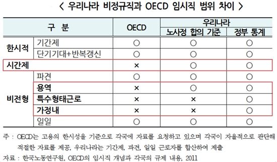 반면 우리나라에서는 기간제, 파견, 일용 근로자 뿐만 아니라 근로시간이 짧은 파트타임, 청소·경비 등 용역 근로자까지 모두 비정규직으로 분류되고 있다.