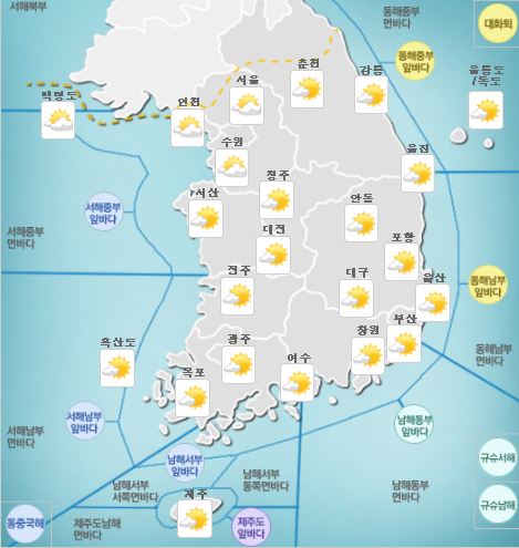 아침 예상 기온은 ▲서울 18도 ▲대전 17도 ▲대구 20도 ▲부산 21도 ▲광주 17도 ▲울산 21도 ▲포항 23도 ▲제주 19도 등이다.