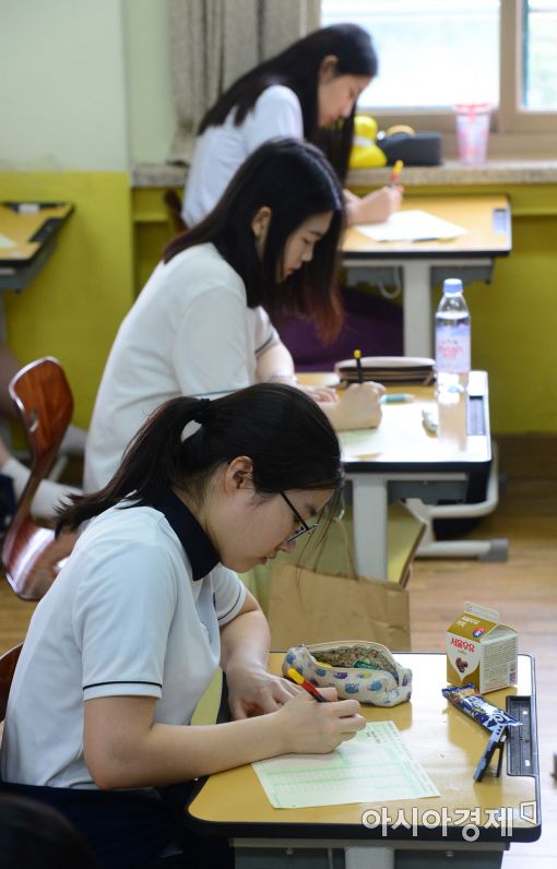 [아시아경제 문호남 수습기자] 2018학년도 대학수학능력시험 6월 모의평가 날인 1일 서울 영등포구 여의도여자고등학교에서 학생들이 OMR카드를 작성하고 있다. 이번 모의평가는 2018학년도 수능부터 적용되는 영어영역 절대평가의 첫 실전연습이며 채점결과는 오는 22일이다.