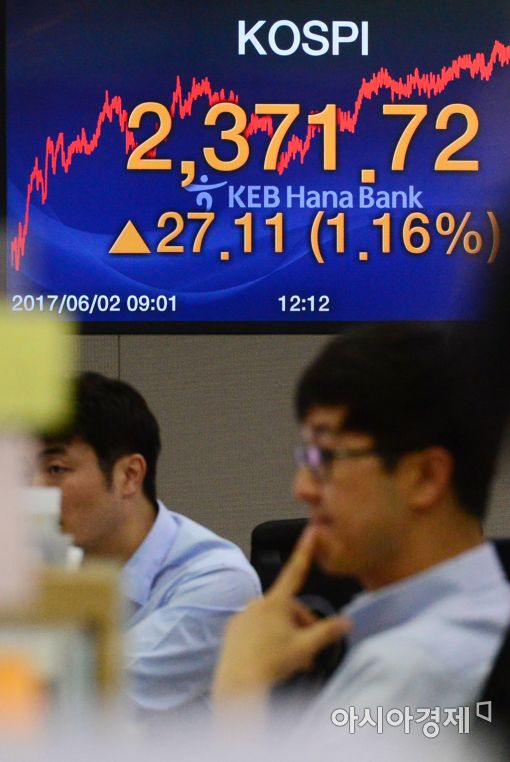[아시아경제 문호남 수습기자] 코스피 지수가 장중 최고치를 경신한 2일 서울 중구 KEB하나은행 딜링룸에서 딜러들이 업무를 보고 있다.