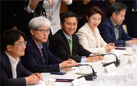 [아시아경제 문호남 수습기자] 김연명 국정기획자문위원회 사회분과 위원장(왼쪽 세 번째)을 비롯한 참석자들이 8일 서울 중구 대한상공회의소에서 열린 '대한상공회의소 - 국정기획자문위원회 사회분과 정책간담회'에서 이동근 대한상공회의소 상근부회장의 발언을 듣고 있다.