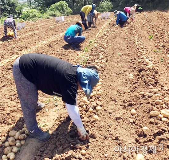 지난 14일 용산면사무소 공무원 20여명은 원등마을 한 농가를 찾아 감자 수확을 하며 구슬땀을 흘렸다.