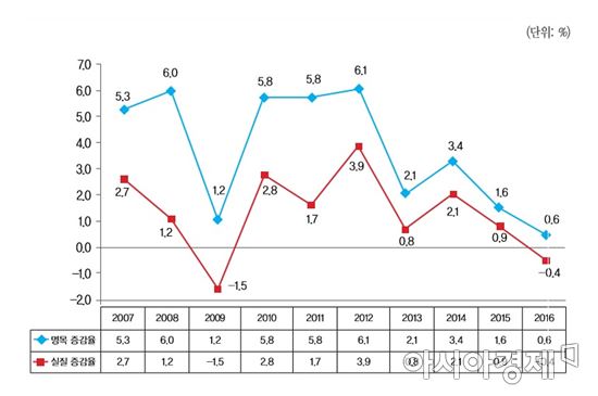 이러한 소득증가율이 물가상승률에 미치지 못하면서 실질 소득증가율은 2009년 이후 7년 만에 감소세로 돌아섰다.