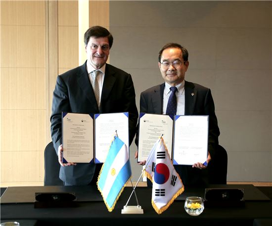[아시아경제(대전) 정일웅 기자] 특허청은 27일 서울 코엑스 인터콘티넨탈 호텔에서 아르헨티나 특허청과 ‘한국-아르헨티나’ 특허청장회담을 갖고 향후 지식재산과 관련된 전 분야에서 양국이 협력을 확대해 나가는 내용의 양해각서를 체결했다. 특허청 이영대 차장(왼쪽 두 번째)과 다마소 파르도 아르헨티나 특허청장(왼쪽 첫 번째)이 기념촬영을 하고 있다. 특허청 제공