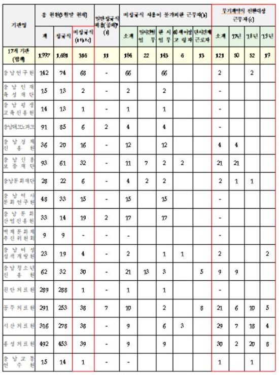 대상기관(정규직 전환 및 채용)은 ▲충남연구원(2명) ▲충남인재육성재단 ▲충남평생교육진흥원 ▲충남테크노파크(2명) ▲충남경제진흥원(4명) ▲충남신용보증재단(21명) ▲충남문화재단(2명) ▲충남역사문화연구원 ▲충남문화산업진흥원(2명) ▲백제문화제추진위원회 ▲충남여성정책개발원(2명) ▲충남청소년 진흥원(9명) ▲천안의료원 ▲공주의료원(28명) ▲서산의료원(29명) ▲홍성의료원(30명) ▲충남교통연수원(1명) 등이다.