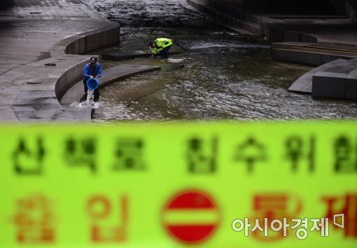 [아시아경제 문호남 기자] 장마전선의 영향으로 전국에 많은 비가 내리고 있는 3일 서울 종로구 청계천에 '산책로 침수 위험 출입통제' 안내문이 설치돼 있는 가운데 환경미화원들이 수위가 높아진 청계천의 물을 퍼내는 등 정화 작업을 하고 있다. 기상청은 모레까지 전국이 장마전선의 영향을 받아 시간당 30mm 이상의 많은 비가 내릴 것으로 전망했다.