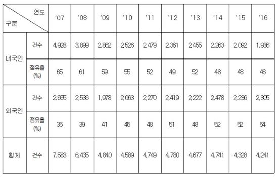 특히 이 기간 내국인의 출원 점유율은 2007년 65%에서 2016년 46%로 떨어진 반면 외국인 점유율은 35%에서 54%로 올라섰다. 내국인의 반도체 제조기술 특허출원이 주춤한 사이 외국인 출원 점유율이 전체의 절반을 넘어선 것이다.
