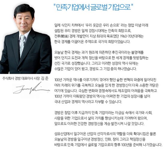 1919년 경성방직으로 출발한 경방은 국내 섬유산업을 이끈 1세대 기업으로 1990년대 이후 섬유 산업이 침체되었음에도 국내 섬유업을 지켜왔다.