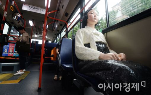 [아시아경제 문호남 기자] 세계 위안부의 날인 14일 동아운수 소속 151번 버스에 일본군 위안부 피해자들의 아픔을 기억하기 위한 평화의 소녀상이 설치돼 있다. 소녀상이 설치된 버스는 2103번·3820번·3873번·3875번·4205번으로 151번 버스 31대 중 5대다. 이 버스는 일본대사관 근처 조계사를 지날 때 위안부 강제동원을 다룬 영화 '귀향'의 OST '아리랑'이 흘러나온다.