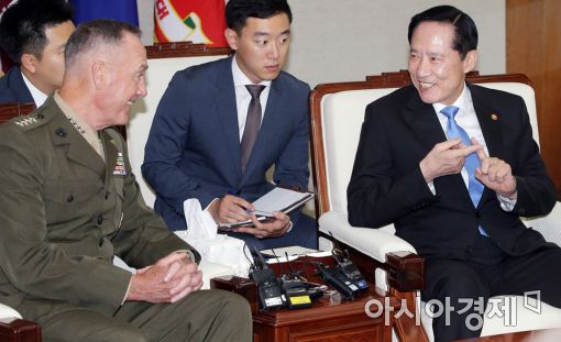 [사진공동취재단] 송영무 국방부 장관(오른쪽)과 조지프 던퍼드 미국 합참의장이 14일 서울 용산구 국방부청사에서 이야기를 나누고 있다.