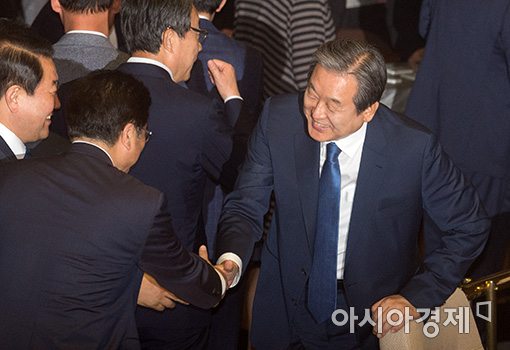 [아시아경제 윤동주 기자] 우원식 더불어민주당 원내대표가 11일 국회 본회의장에서 김무성 바른정당 의원을 만나 인사를 나누고 있다.