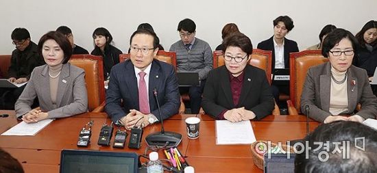 홍영표 국회 환노위위원장과 한정애 더불어민주당 간사, 임이자 자유한국당 간사, 김삼화 바른미래당 간사가 27일 국회에서 근로시간 단축과 관련해 기자간담회를 갖고 있다. 국회 환노위는 주당 법정 근로시간을 68시간에서 52시간으로 단축하는 내용의 근로기준법 개정안을 통과 시켰다./윤동주 기자 doso7@