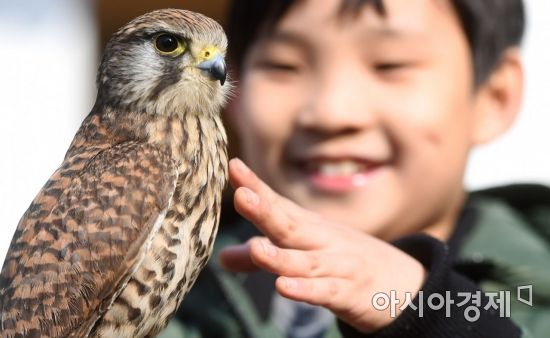 천연기념물 제323-8호, 황조롱이가 11일 서울 중구 남산골한옥마을에서 열린 매사냥 체험 행사에서 멋진 자태를 뽐내고 있다. 황조롱이는 소형맹금으로서 정지비행의 명수이며 들쥐나 작은동물 등을 잡아먹고 산다. 비교적 성격이 온순하고 사람과의 친화력도 좋아 종종 아파트 베란다에서 번식을 하기도 한다. 참새나 메추라기 등 작은 새를 잡는데 쓰였다. /문호남 기자 munonam@